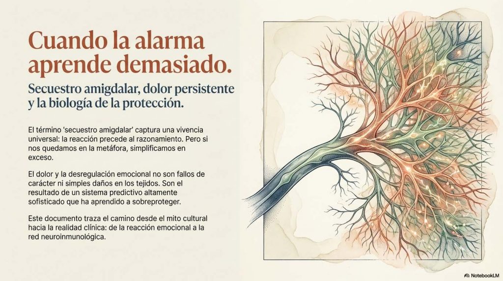 En resumen, la comprensión del «secuestro amigdalar» en el contexto del dolor persistente nos ofrece mucho más que una metáfora explicativa. Nos ofrece un marco integrado que conecta neurobiología, inmunología, fisiología del sueño, teoría de sistemas autonómicos, neurociencia predictiva y práctica clínica real; nos convoca, como profesionales y como seres humanos que también habitamos cuerpos vulnerables, a aproximarnos al sufrimiento con rigor científico y compasión genuina. A ofrecer comprensión sin simplificación. A acompañar sin rescatar. A sostener sin abrumar.
