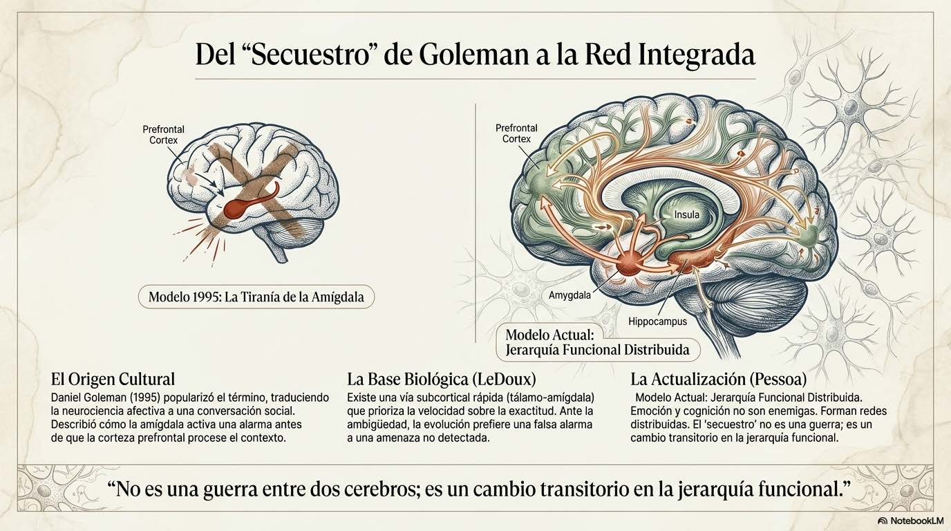 La amígdala interactúa de forma constante y bidireccional con la corteza prefrontal medial, la ínsula anterior, el hipocampo y otras regiones implicadas en la construcción de significado, la predicción corporal y la regulación autonómica. El llamado «secuestro» no es una guerra entre dos cerebros sino un cambio transitorio en la jerarquía funcional dentro de una red compleja, un desplazamiento temporal de la dominancia desde circuitos de evaluación contextual hacia circuitos de respuesta rápida.