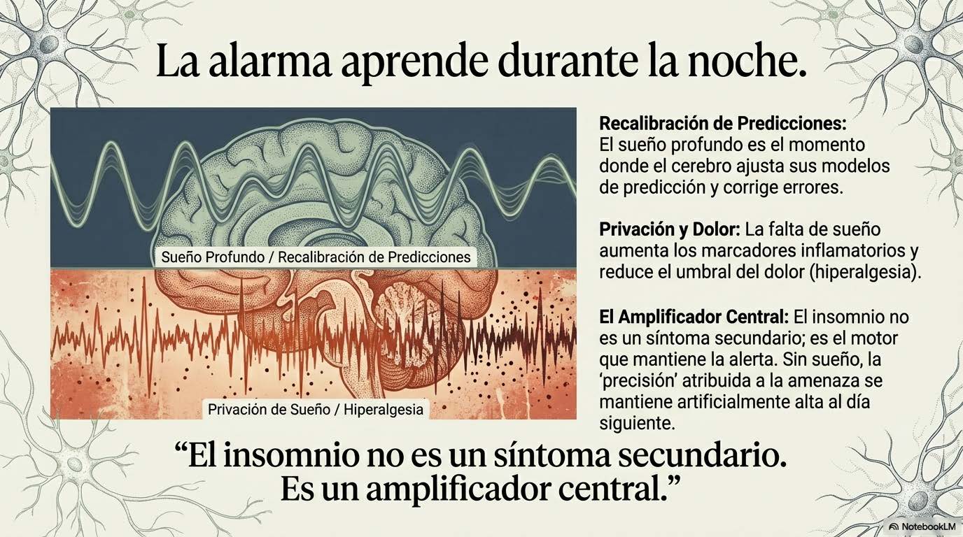 El sueño profundo, especialmente las fases de sueño de ondas lentas, regula la expresión génica, modula la liberación de citoquinas antiinflamatorias como IL-10, facilita la consolidación de memoria emocional y permite la recalibración de sistemas de evaluación de amenaza (Haack et al., 2007). Cuando el sueño se fragmenta de manera crónica —como ocurre con frecuencia en dolor persistente, donde el dolor interrumpe el sueño y la falta de sueño amplifica el dolor—, el sistema pierde una de sus principales ventanas de recuperación y regulación. La falta de sueño aumenta los niveles circulantes de marcadores inflamatorios. Reduce la tolerancia al dolor. Disminuye la capacidad de regulación emocional. Estrecha la ventana de tolerancia al estrés. No es casualidad que en muchas condiciones de dolor crónico la mejora del sueño sea uno de los predictores más consistentes de mejora funcional global.
