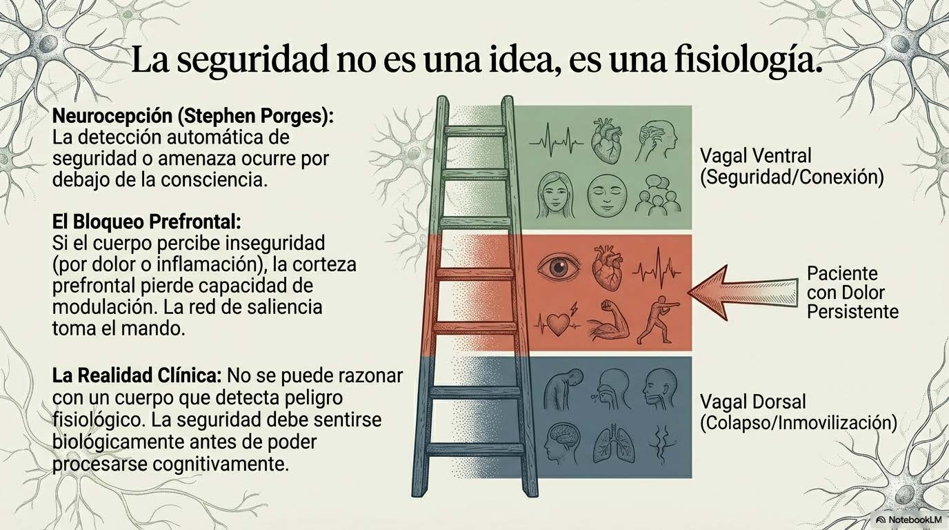 La educación en neurociencia del dolor —lo que Moseley y Butler llaman «Explain Pain»— es componente fundamental, pero no suficiente. Explicar la biología del dolor reduce el miedo y la culpa, normaliza la experiencia y ofrece un marco de comprensión que puede ser profundamente liberador. Pero la comprensión intelectual no cambia, por sí sola, el modelo predictivo implícito. El sistema necesita experiencia, no solo información. El contexto relacional no puede ser ignorado. La teoría polivagal subraya que el sistema nervioso detecta seguridad no solo a través de evaluación cognitiva sino a través de señales implícitas del entorno social. La presencia de otro ser humano regulado puede co-regular. El juicio percibido puede intensificarla.