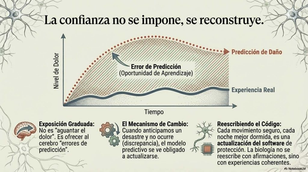 Cuando un paciente con dolor persistente realiza un movimiento que anticipaba como devastador y la experiencia real, aunque no sea placentera, resulta tolerable y no genera el colapso esperado, se produce una discrepancia entre predicción y resultado. Esa discrepancia, si ocurre en un contexto suficientemente seguro y se repite con la frecuencia adecuada, permite ajustar el modelo. El sistema actualiza. La precisión atribuida a la amenaza disminuye ligeramente. El margen se amplía un poco.