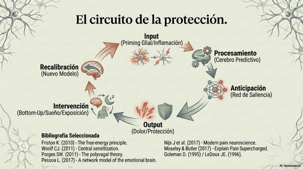 En este marco conceptual, la nocicepción no es simplemente una señal que asciende desde la periferia hacia el cerebro esperando ser interpretada. Es información que el sistema compara continuamente con su modelo interno de cómo debería ser el cuerpo. Si el modelo interno atribuye alta precisión a la amenaza —porque ha aprendido vulnerabilidad, imprevisibilidad, daño previo que no fue anticipado o protegido adecuadamente— la predicción tenderá a inclinarse hacia la protección incluso antes de que la señal sensorial esté completamente procesada en términos de detalle contextual.