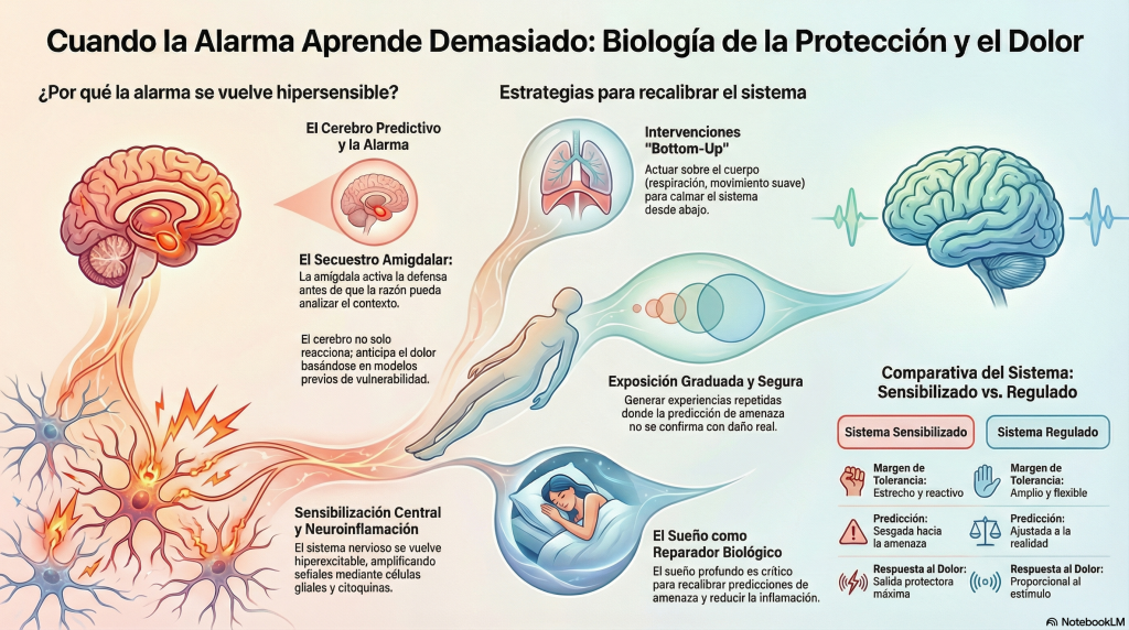 En este punto, el secuestro amigdalar deja de ser una anécdota emocional circunscrita a situaciones de estrés agudo y se convierte en pieza dentro de un sistema más amplio de priorización protectora que opera de manera crónica en condiciones de dolor persistente. La amígdala participa activamente en la asignación de relevancia a estímulos interoceptivos —señales que provienen del interior del cuerpo— y exteroceptivos —señales del entorno—. Cuando el sistema ha aprendido que determinados movimientos, contextos o sensaciones corporales preceden al dolor, la activación amigdalar puede adelantarse a la confirmación sensorial completa. La predicción pesa más que la señal. El sistema no espera a comprobar si realmente hay peligro; actúa basándose en la probabilidad aprendida de que lo haya.