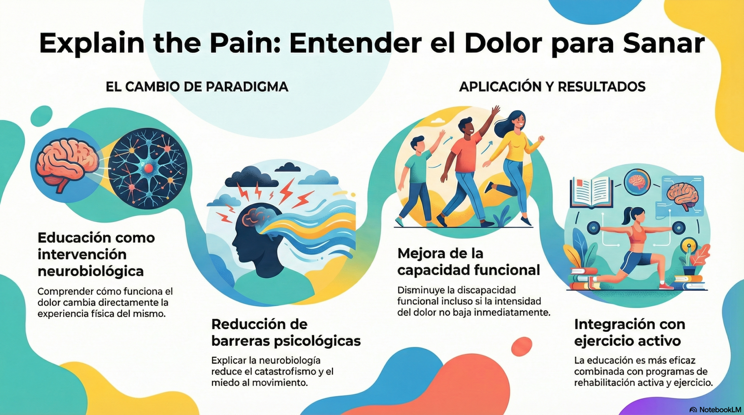 Este marco teórico sustenta la educación en neurociencia del dolor, conocida como Pain Neuroscience Education o Explain the Pain. Desarrollada por Butler y Moseley, esta intervención parte de una premisa clara: comprender cómo funciona el dolor cambia la experiencia del dolor.